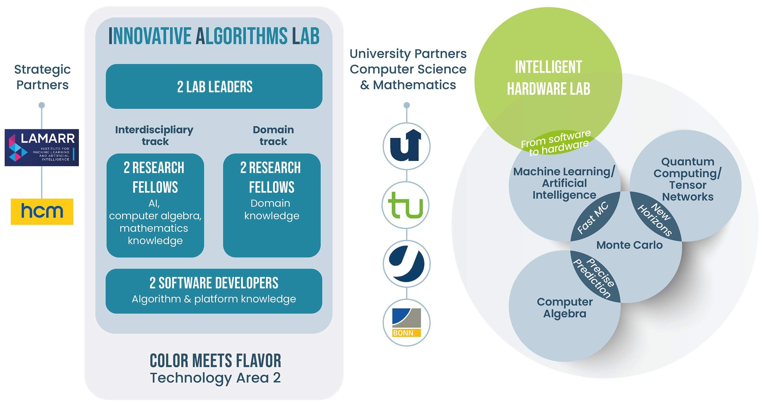The IAL will bridge domain-specific knowledge with algorithmic expertise from computer science and mathematics. It operates in close partnership with the Lamarr Institute for Machine Learning and Artificial Intelligence and the Hausdorff Center for Mathematics (HCM). This effort builds on collaborations with principal investigators from the CRC 1639 NuMeriQS “Numerical Methods for Dynamics and Structure Formation in Quantum Systems”, and FOR 5582 “Modern Foundations of Scattering Amplitudes”. The IAL is currently lead by PIs Bernlochner and Krieg.