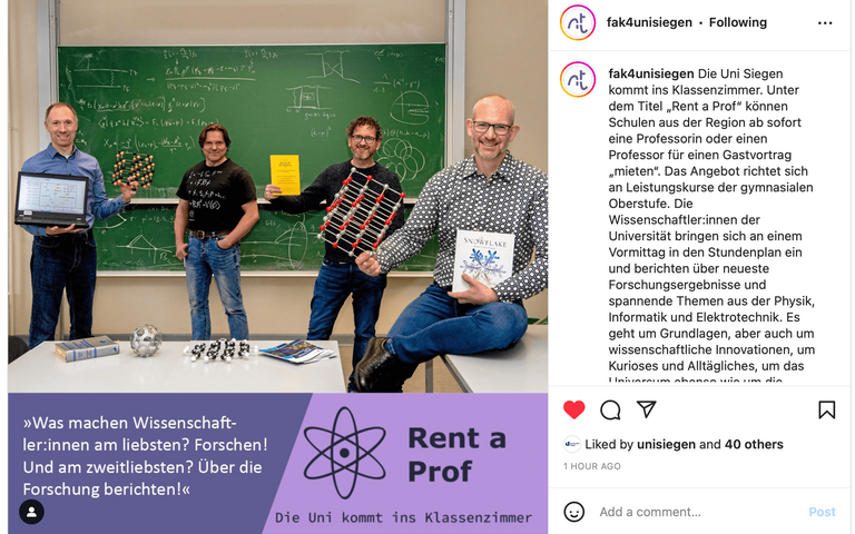 To attract already young pupils we started recently an Instagram channel, where we report about the life of our researchers, ranging from master students to senior professors.