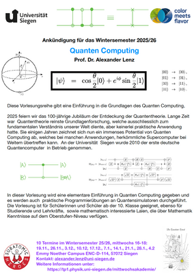 In the approaching winter semester, the Mittwochsakademie will return at the University of Siegen. The format is directed towards everyone interested in physics and will cover the aspects of quantum computing this year. The lectures will be given by Prof. Dr. Alex Lenz and start on November 19, 2025. More details can be found here.