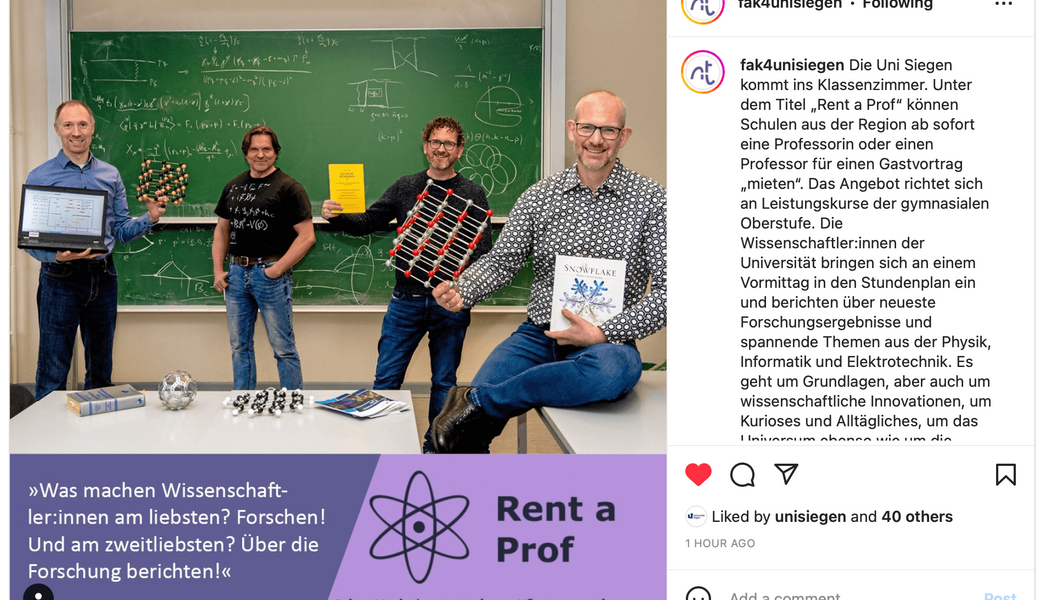 The "Rent a Prof" programme offers lectures to schools, where topics of current physics research are presented. With that we provide a glimpse into science as well as in the academic and research environment at universities. In particular in primary schools and in the early years of secondary school interest for these activities turns out to be balanced among different genders. We started these events in Siegen and plan to extend them to Bonn, Jülich and Dortmund.