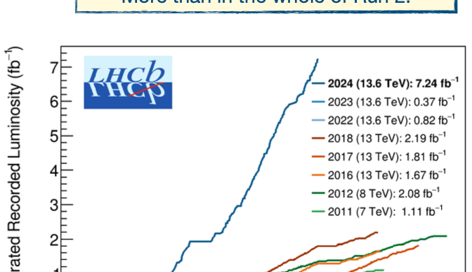 As reported at the LHCC Open Session in September, LHCb has recorded data with a corresponding integrated luminosity of more than 7.24 fb-1 in 2024. This is more than the total luminosity in the data taking phase between 2015 and 2018 and demonstrates the excellent performance of the LHC and the LHCb detector after Upgrade I. The enormous amount of b- and c-quark mesons recorded will help to deepen and extend the LHCb physics program in the coming years.